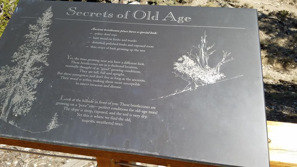 I continued on through this landscape wondering if I had reached this mythical Ancient Bristlecone Forest announced by the sign illuminated by the the early morning glow of the sun from behind the mountains. The pines didn’t look particularly unique so I was reasonably sure I wasn’t in the midst of the wise conifers yet. Sure enough, I came to what we would be my final left hand turn with a sign. A sign that would lead me to what I would learn were the oldest trees in the world. Yes, the OLDEST TREES IN THE WORLD! What? Crazy!