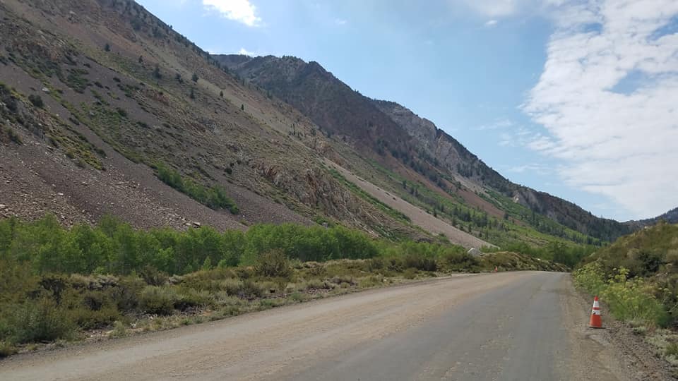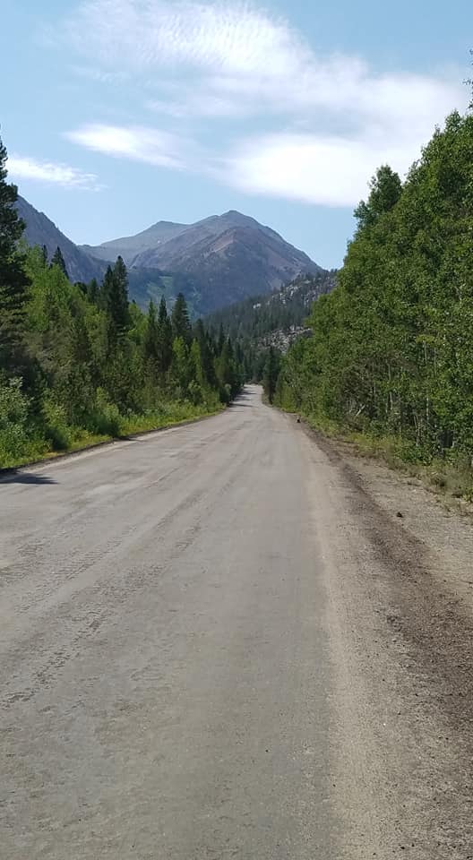 Normally, I would think the next final miles would be serene and light on traffic. However, I hit the summer road crew. As I turned onto South Lake Rd I spent the next 5 miles dodging earth movers, asphalt crews, one way dirt roads with flaggers, etc. Every time I had to stop to wait my turn to go through I could only think of two things. First, the poor cars in back of me had to wait for me to peddle through until they could pass me. Second, afternoon thunderstorms are coming and I need to get up and out of here! Double anxiety if you will. Still, the views were spectacular and the further I rode the more impressive they became.
