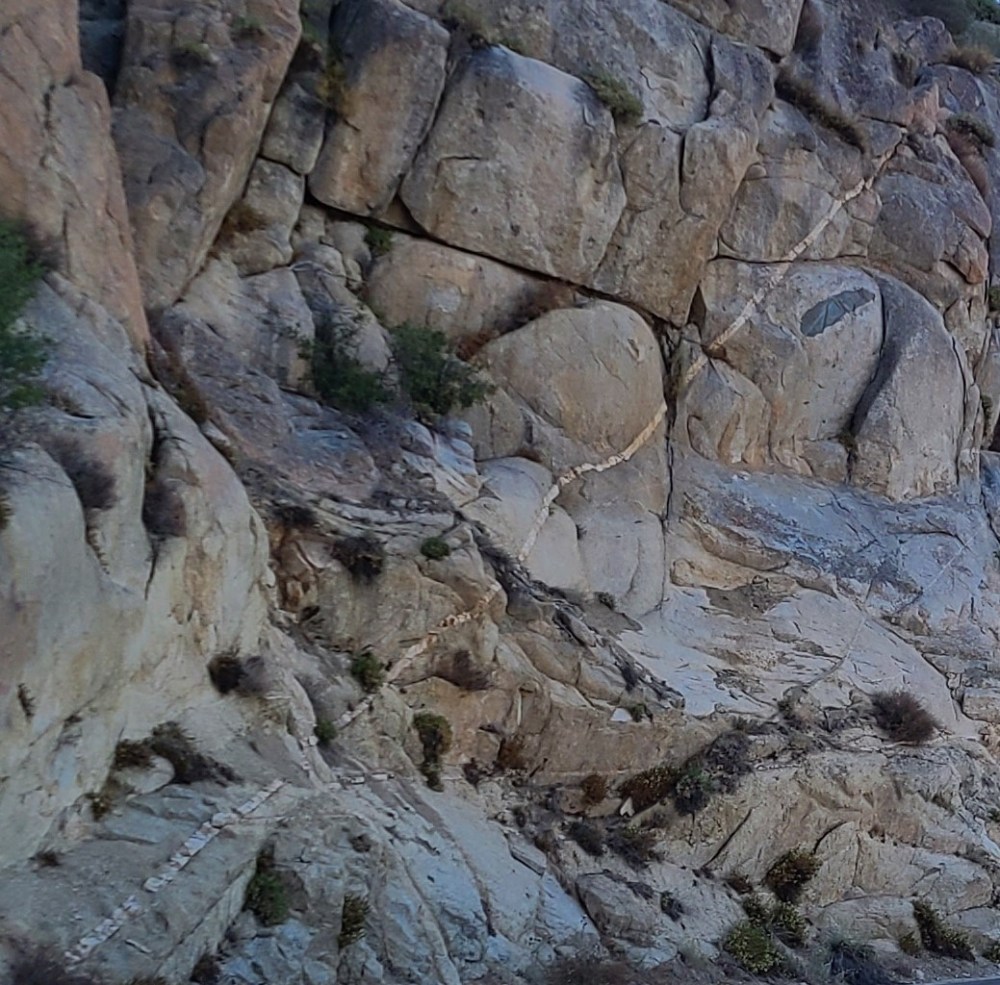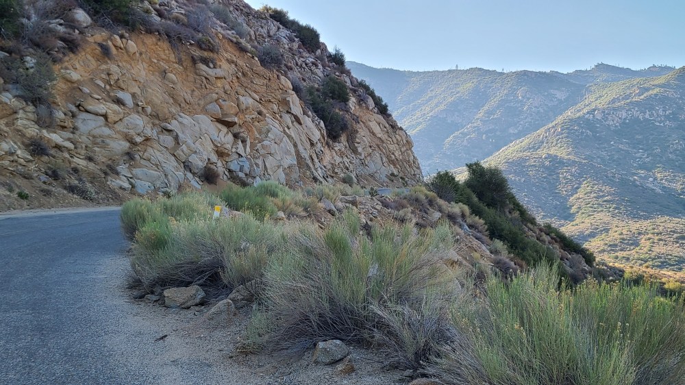 As I passed 5,000 feet above sea level, I noticed an approaching turn with towering rocks on the left. I saw from a distance an interesting feature in the rocks. Somehow, in this almost solid rock formation, there was this layer of rock that ran through the whole thing at about a 45 degree angle. One of those moments where I wished I was a geologist to understand what that meant and how that happens. But no, I just know what people like to eat. I am very geology challenged. I didn’t take any geology classes in college. I was a broadcasting major for goodness sake. Maybe a little regret now? Years spent understanding radio commercial structure instead of how the world evolved? Just sayin’.