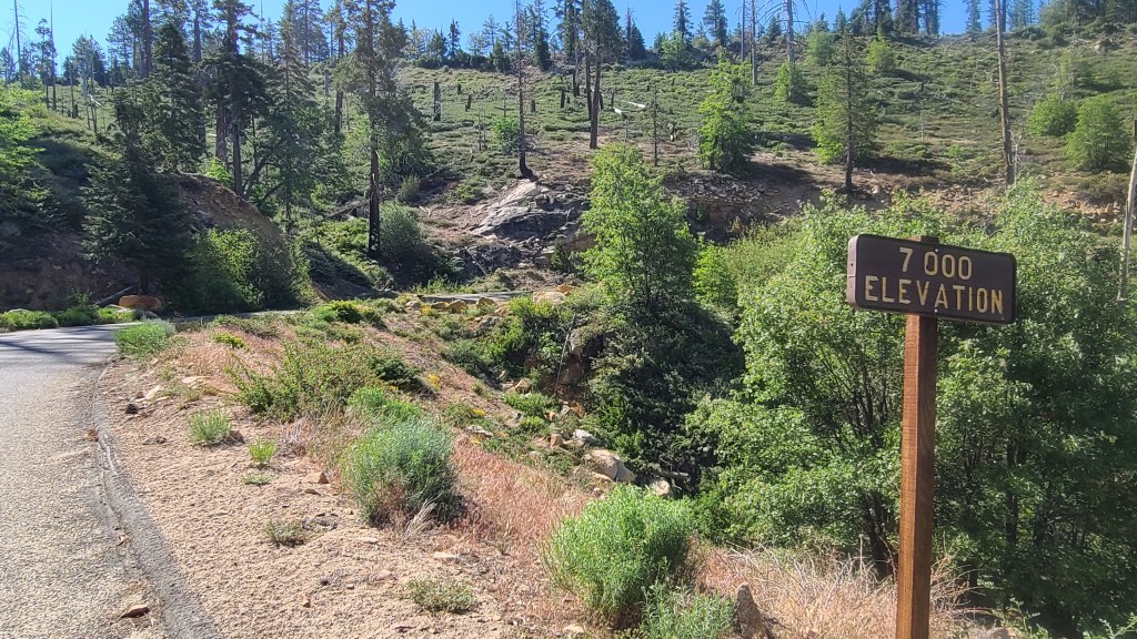 In a day of opposites, at 8,000 feet above sea level came the next Captain Obvious moment. It became much cooler, but I began to feel the effects of less oxygen at this height. I definitely perform better in lower temperatures as I have aged, but I also perform better when there is oxygen. Still, I think I am above average on dealing with this issue. Just keep pedaling I told myself. Just keep pedaling…