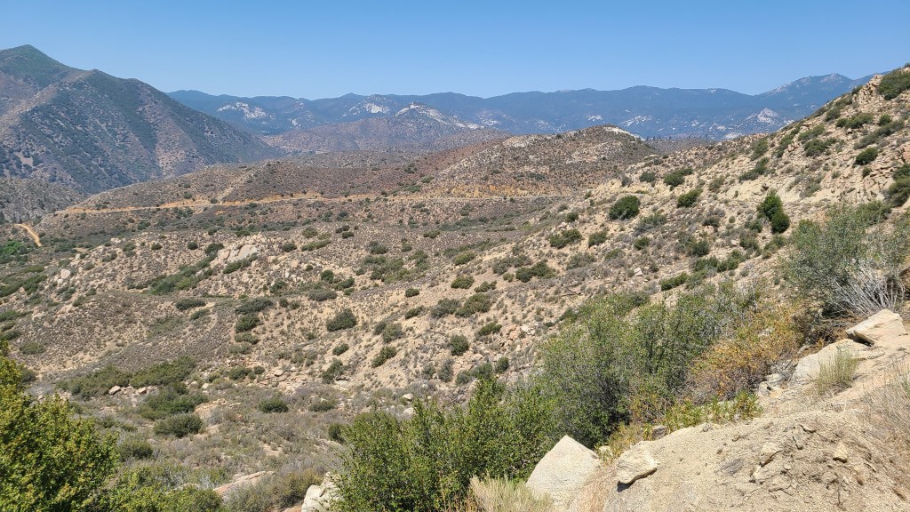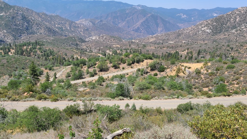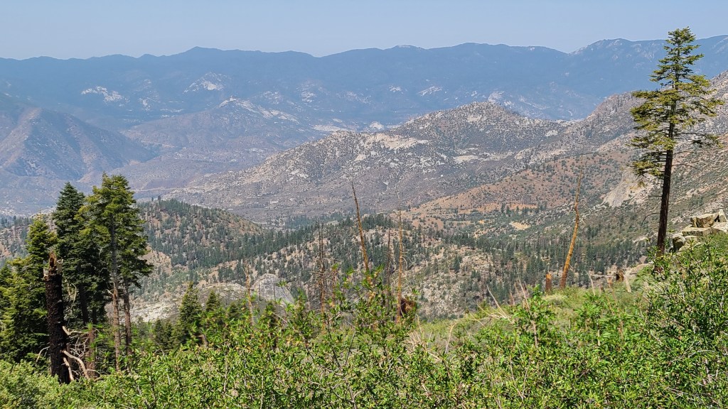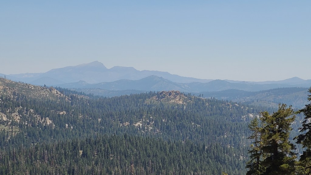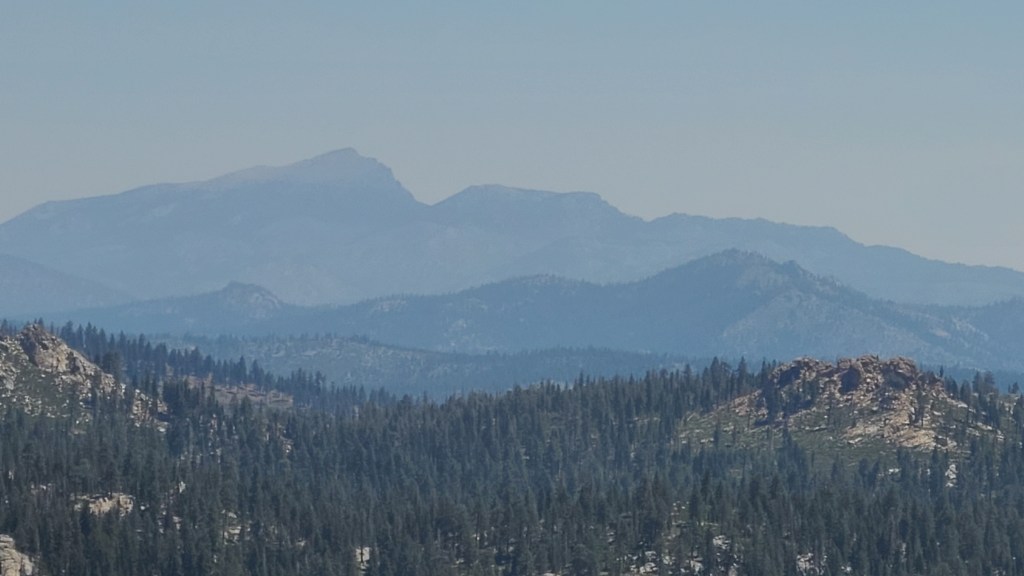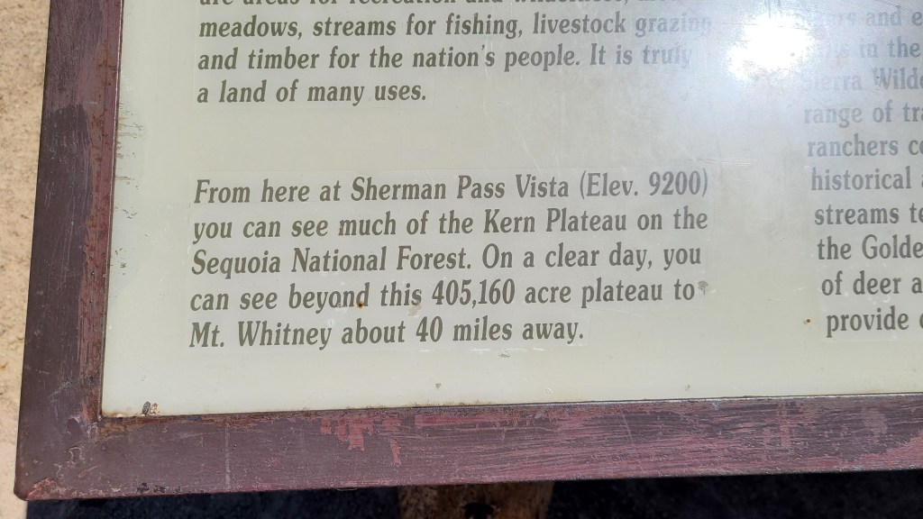 Finally, I crested. Usually, there is some sort of view or reward. I would not be disappointed. It was a perfectly clear day across the Kern Plateau in the Sequoia National Forest. As the view marker pointed out, I could actually see Mt Whitney (the highest elevation in the lower 48) across the 405,160 acre plateau 40 miles away!
