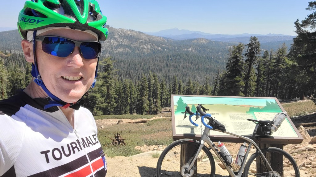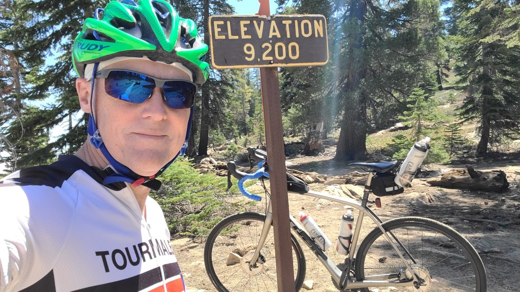 To commemorate tackling #4 on the California Hardest Cycling Climbs list, there was the gratuitous selfie in front of the elevation sign at 9,200 feet above sea level. My badge/trophy for a few hours of hard work toward a shelf full of these.