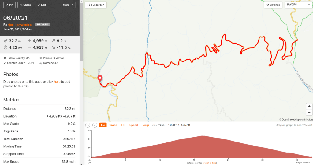 The theme this year is “Unfinished Business.” I have headed back up to the Sierras to finally check the boxes on the 10 hardest cycling climbs in California. There are three left to complete and today was #4 hardest on the list. Sherman Pass is a 15.5 mile climb that will ascend 5,305 feet up to 9,200 feet above sea level. And…a climb it is. There is not one downhill section in those 15.5 miles. It is all grind all day until you turn around and descend.